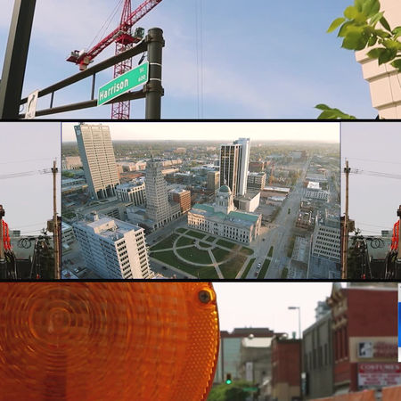 Once we were greenlit for a new set in 2021, I worked with our corporate ownership, other department heads, and my art director to renovate our studio. A corporate design team asked for input from previous set builds, and we adjusted the designs to create something unique in both our market and the station group. Utilizing monitors to maximize flexibility, some personal touches include a map of Fort Wayne behind the weather helm, and an outstanding use of graphics to tie in the back and front of the main anchor desk. The set was finalized and installed by a corporate team, and my creative team used our current look plus elements of our city to finish off the graphics. Combined with new lighting, new robotic cameras, the set looks amazing on camera and in person. Walking through the studio still makes me smile with pride. Here is an "Under Construction" spot that aired as we constructed the set while broadcasting from a small, temporary one. I wanted to tie in the major growth of our downtown and feeling of optimism to our new set, with an eye towards what was to come. When we launched, I wanted to push us into the future with a nod to our past. We used our new studio space to show some of the most iconic moments from Fort Wayne (and WANE's) past. I've also included a small gallery of set photos.